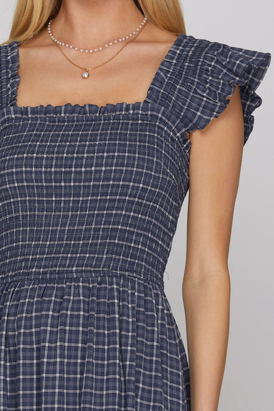 Stevie Ruffle Strap Navy Checkered Midi Dress