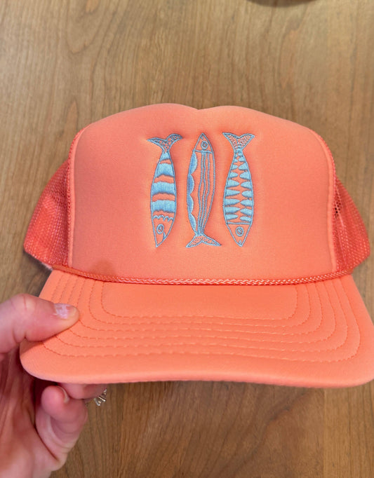 Sardine Summer Trucker Hat: Coral hat | light blue thread