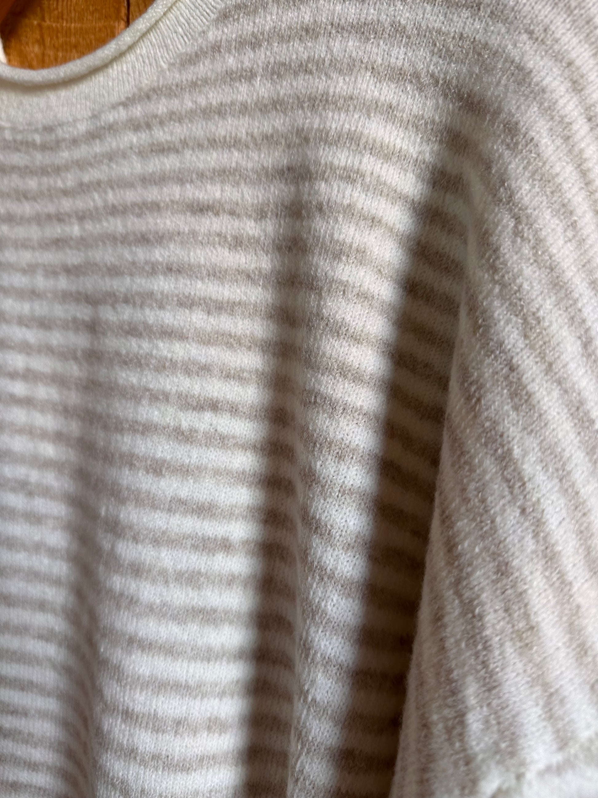 A soft lightweight striped knit top with a relaxed and airy silhouette. Fabric and Fit Made from a soft and breathable knit with a gentle brushed texture that feels light against the skin. Designed with a relaxed drape and an easy slightly cropped length that sits naturally at the waist. The drop shoulder construction adds comfort and gives the piece a calm effortless shape suitable for warm or transitional seasons. Key design features Soft horizontal stripe pattern Relaxed airy silhouette Drop shoulder construction Lightweight brushed knit texture Straight hem finish Recommended Use Perfect for everyday casual wear or light spring layering