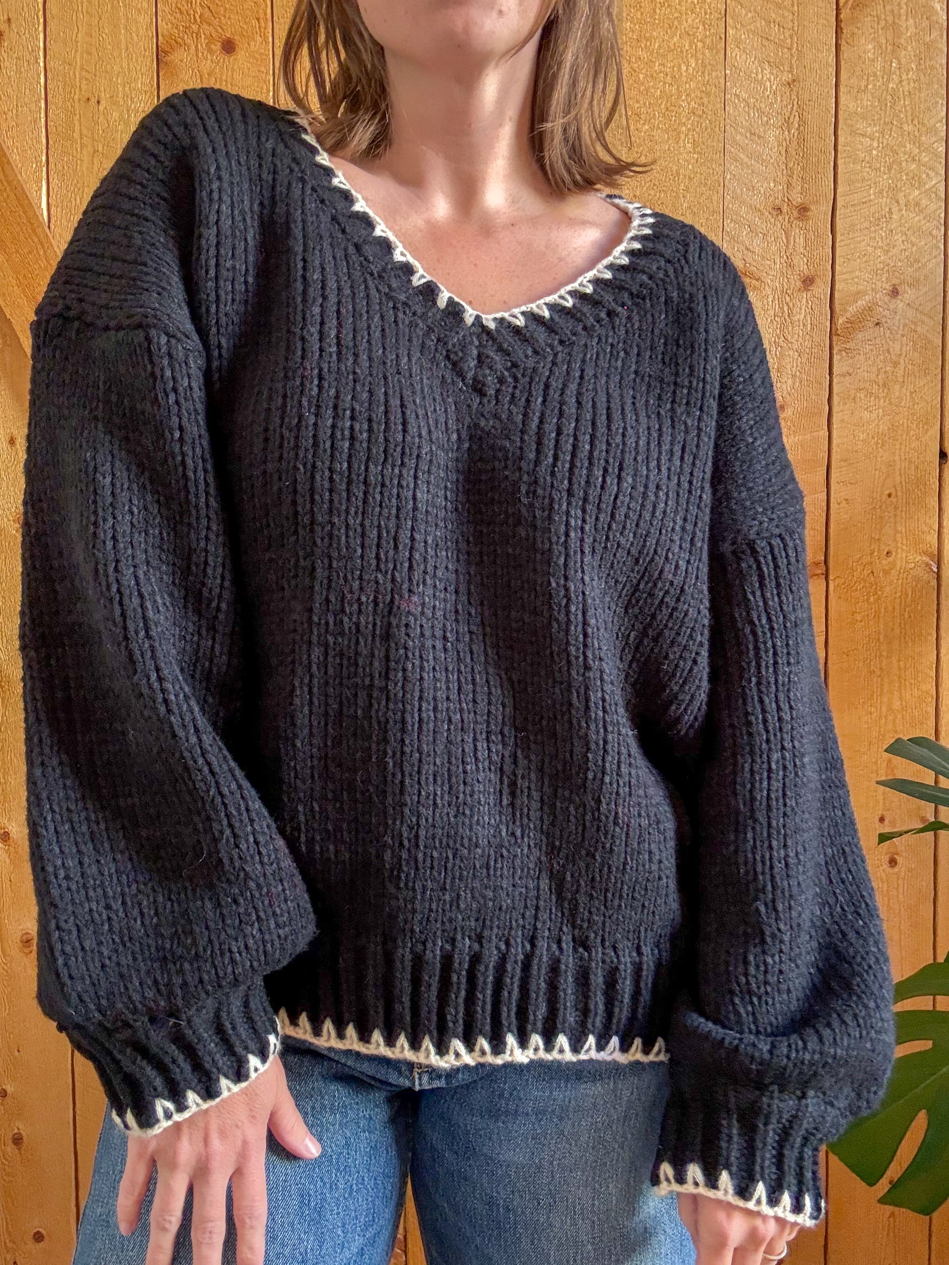 The Delaney Oversized Contrast Stitching Sweater combines relaxed luxury with refined detail. Crafted from a heavy knit, this V-neck sweater features subtle contrast stitching that enhances its sophisticated silhouette. Perfect for layering or making a statement on its own, it offers both comfort and elegance for cooler days.