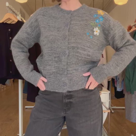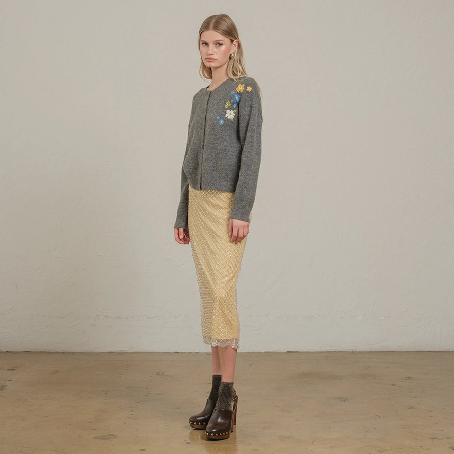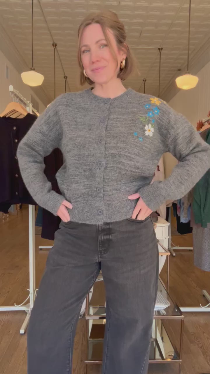 A cozy knit cardigan with delicate floral embroidery details across the shoulder and back. This soft grey sweater adds a playful yet feminine touch with colorful yellow, blue, and white flower embroidery. Perfect for layering in all seasons, it’s an effortless piece that elevates any casual or dressy look. -Soft knit fabric for comfort -Button-down front closure -Multicolor floral embroidery detail (front & back shoulder) -Relaxed fit silhouette