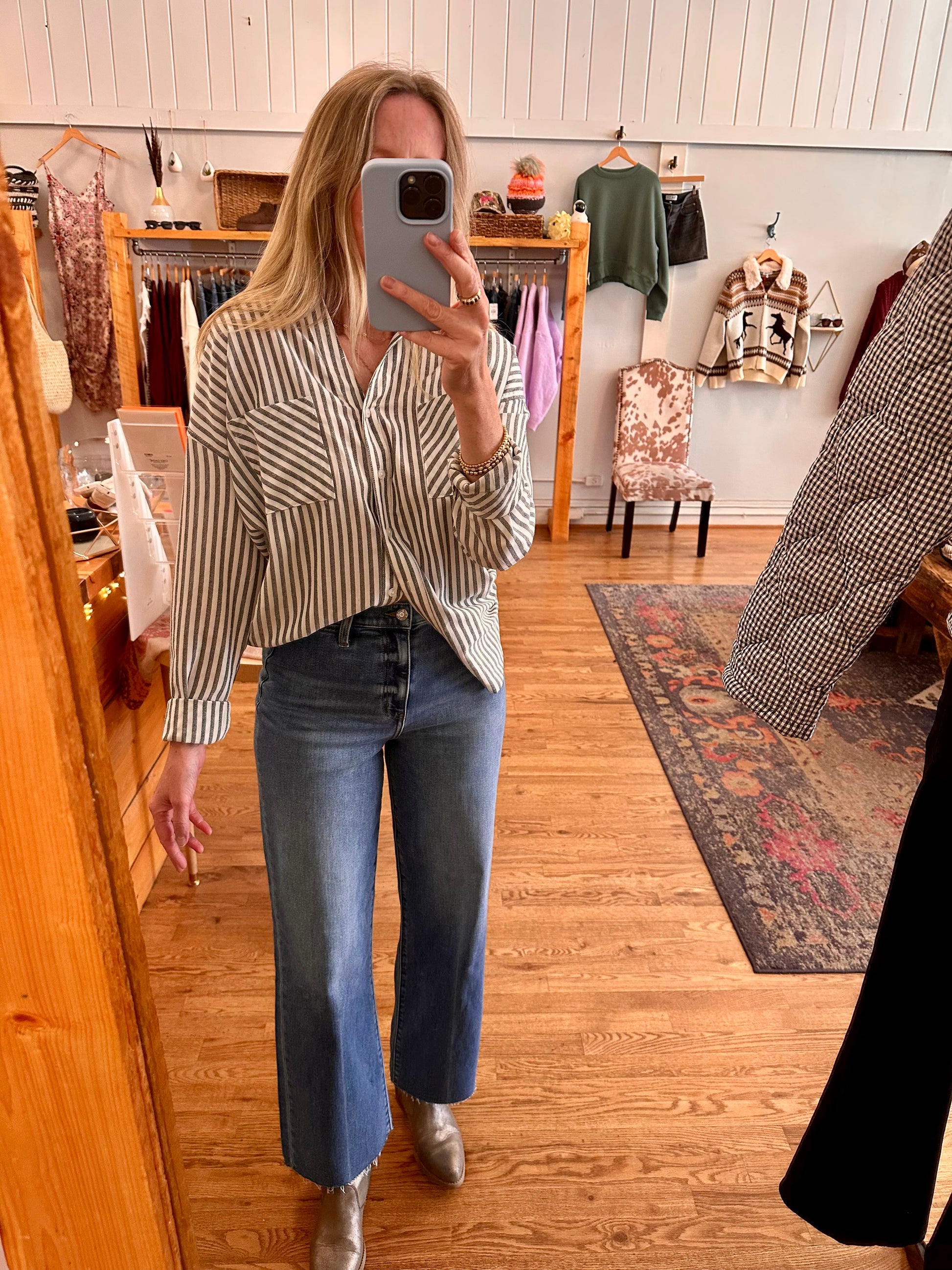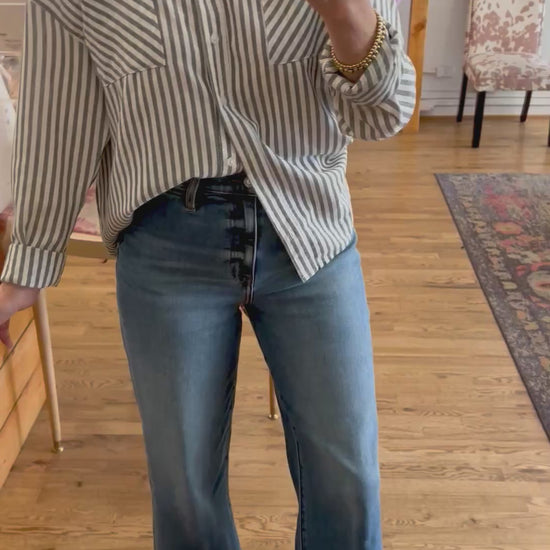 The Pleaser is our tried and true high rise wide ankle, featuring seaming details at the waist against an indigo blue wash with slight fading. This fit is constructed from our Hug denim, which is flexible enough to hug your body, yet heavy enough to cinch you in. With welt pocket