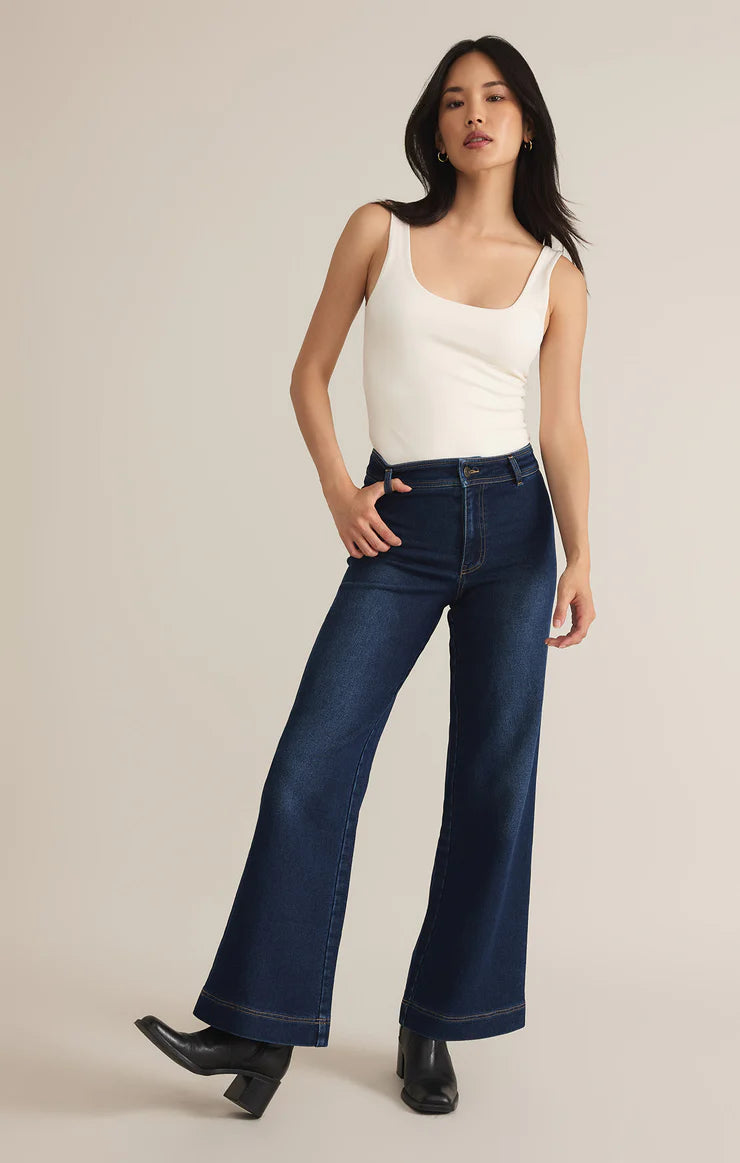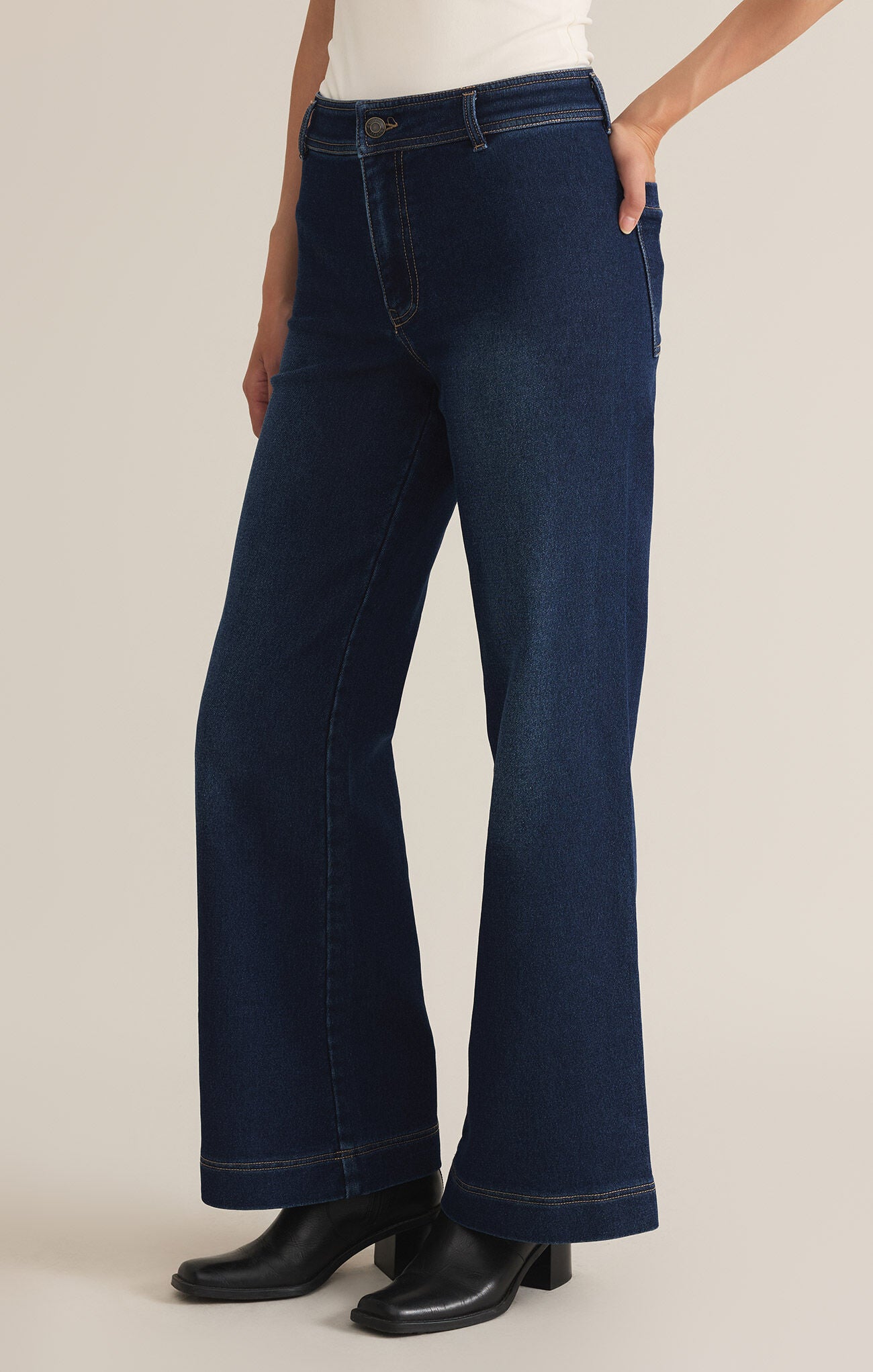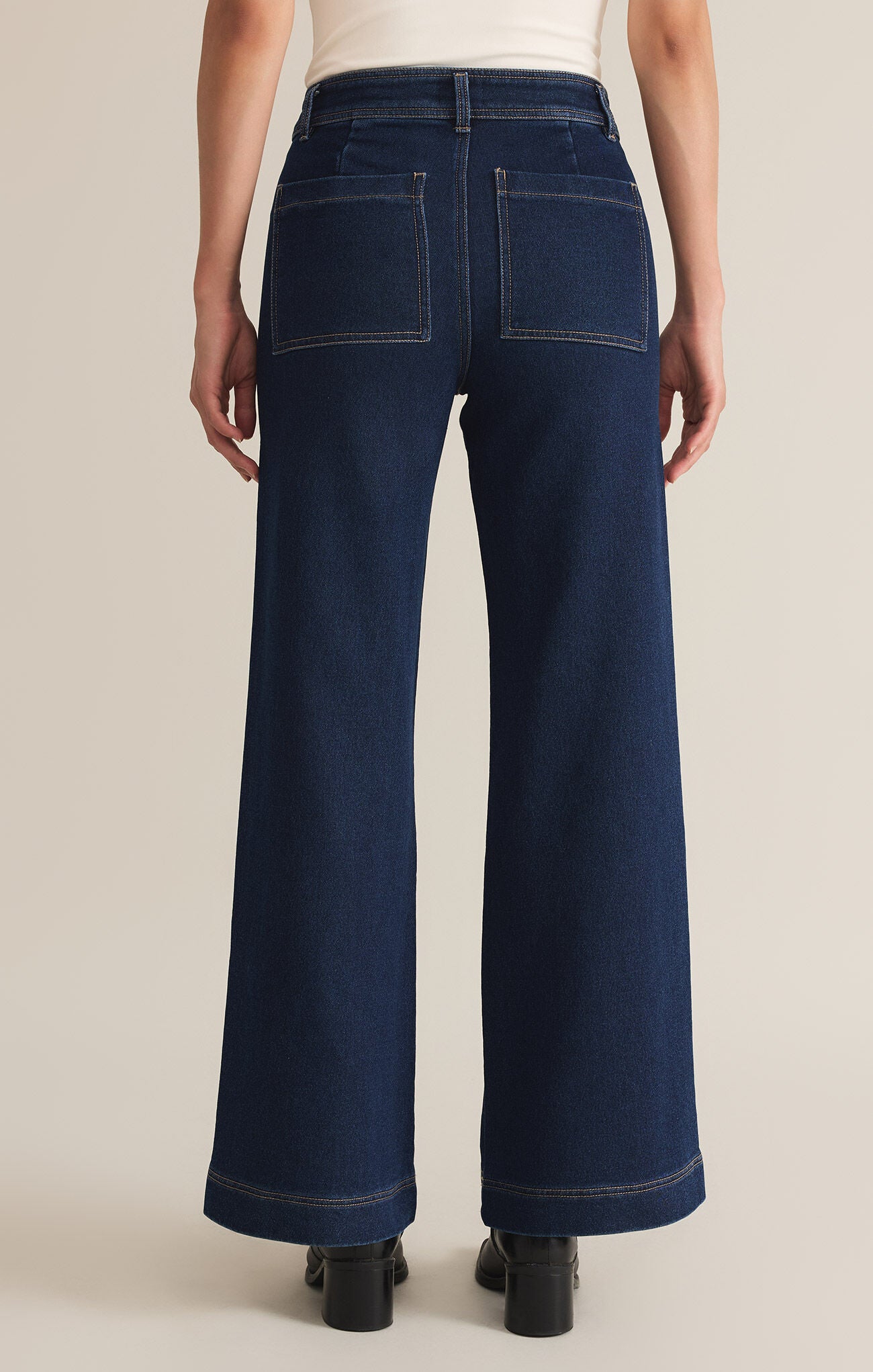Chic mid-rise wide leg trouser, crafted from premium heavyweight denim for a sophisticated look and durable feel. With patch pockets at the back, a structured waistband, and wide hem detail, these full-length trousers offer timeless style.