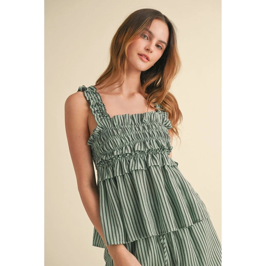 Sleeveless with ruffle detailing. Bottom Details: Matching shorts with an elastic waistband for an adjustable fit. Make it a match with the Arri striped shorts