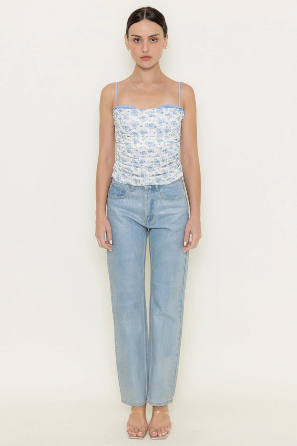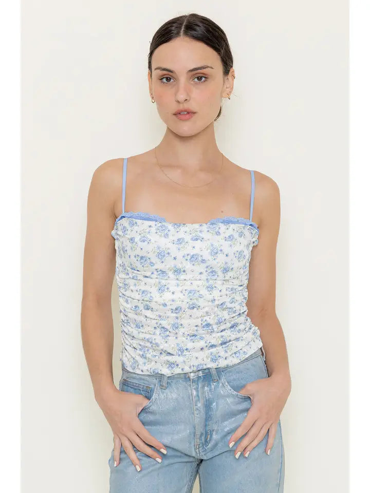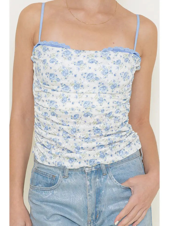 Elevate your wardrobe with the Sadie Ditsy Floral Top, featuring a delicate ditsy floral print, subtle sequence and an eyelash lace bra insert for subtle elegance. The thin adjustable spaghetti straps ensure a perfect fit, while the ruched bust adds refined texture. Its semi-cropped length offers a modern silhouette, making this top a sophisticated choice for layering or wearing on its own.